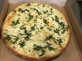 White pizza (no red sauce). Ricotta cheese, mozzarella, EVOO, fresh garlic and fresh basil.